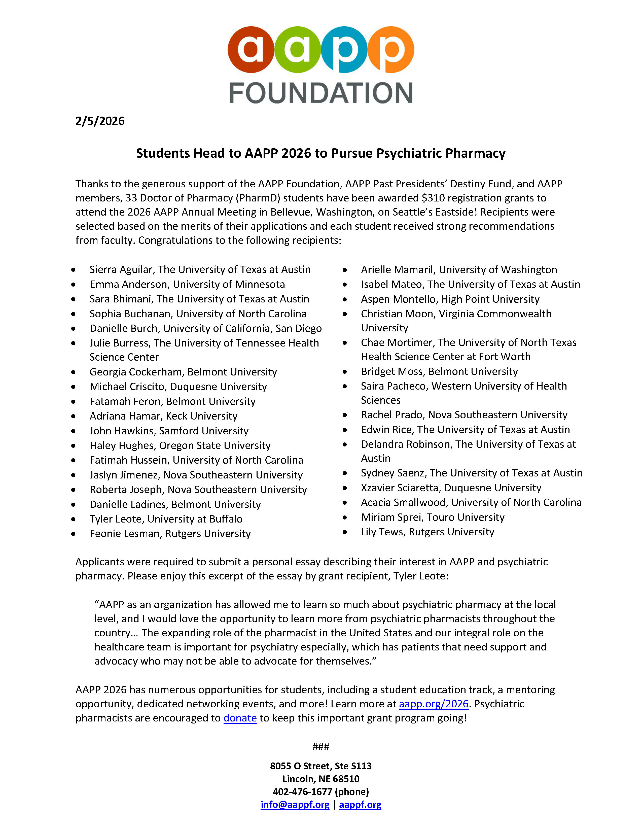 These recipients represent individuals and institutions who are advancing psychiatric pharmacy through creative, innovative, and informative work. We applaud their work and are proud to support them in their endeavors. Project results will be shared during poster sessions at the 2026 AAPP Annual Meeting in Bellevue, Washington. Thanks to the supporters of the AAPP Foundation, this grant program was expanded in 2025 to allow for larger project budgets and to include submissions from new practitioners, in addition to previously allowed students, residents, and fellows. To support this annual grant program, please consider a donation! The AAPP Foundation Board of Directors appreciates your support and works hard to be great stewards of all donations. Download the Full Press Release |  | | | | Thanks to the generous support of the AAPP Foundation, AAPP Past Presidents’ Destiny Fund, and AAPP members, 20 Doctor of Pharmacy (PharmD) students have been awarded $290 registration grants to attend the 2025 AAPP Annual Meeting in Salt Lake City, Utah! Recipients were selected based on the merits of their applications and each student received strong recommendations from faculty. Applicants were required to submit a personal essay describing their interest in AAPP and psychiatric pharmacy. Please enjoy this excerpt of the essay by grant recipient, Suzie Yoon: “Attending the AAPP Annual Meeting represents the next step in my journey toward becoming a psychiatric pharmacist…[It] will serve as a bridge between my aspirations and the future I envision; one where I continue to contribute to advancing mental health care and improving outcomes for individuals facing psychiatric challenges.” AAPP 2025 has numerous opportunities for students, including a student education track, a mentoring opportunity, dedicated networking events, and more! Learn more at aapp.org/2025. AAPP Foundation supporters are encouraged to donate to keep this important grant program going! Download the Full Press Release |